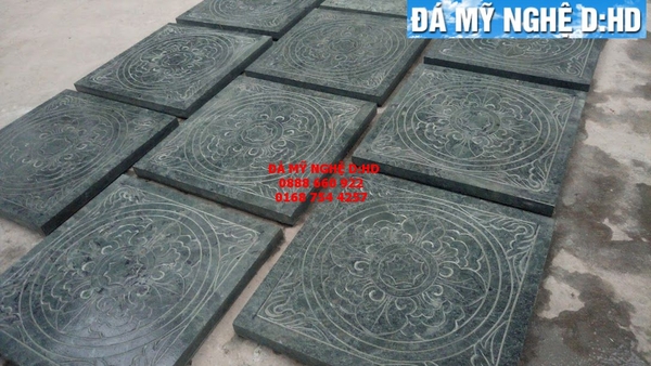 Hoa văn đem can lên bề mặt đá sau đó thợ khắc sẽ dùng thiết bị máy để chạm theo đường nét trên đá , tuy đã có máy móc hỗ trợ nhưng để có những viên đá lát nền đẹp vẫn đòi hỏi người chạm khắc có tay nghề cao và mắt thẩm mỹ mới có thể làm được do đó đá lát vẫn được coi là hàng thủ công mỹ nghệ chứ không phải sản xuất hàng loạt .Đá lát nền chủ yếu được sản xuất theo yêu cầu đặt hàng của khách hàng.