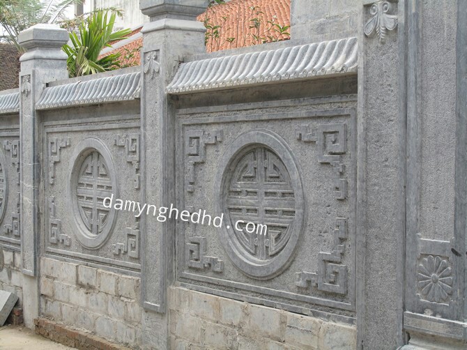 Trên các vách của lan can đá được lợp các lớp mái kiểu ngói hình ống. Mẫu tường bao này thích hợp cho những kiến trúc biệt thự, nhà vườn cổ, đình chùa, nhà thờ họ...