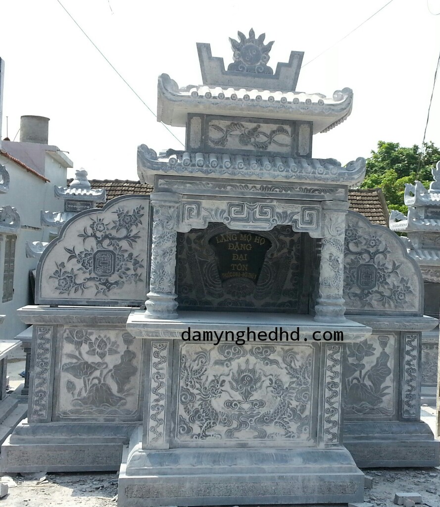 Hoa văn lăng mộ đá chạm khắc rồng chầu mặt nguyệt, hoa sen,mai cài thọ,và các hoa văn trang trí khác.