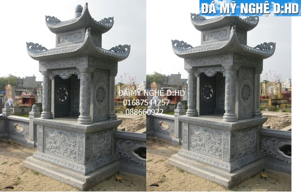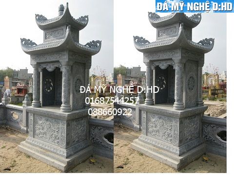 Lăng thờ đá hai mái thiết kế chuẩn đẹp mắt về tỉ lệ hình khối, chất liệu đá xanh tự nhiên bền vững . Long đình đá chạm khắc tứ linh tinh tế,hai cột phía trước có hai câu đối chạm nổi. Mái đao chế tác cong vút kiểu mái đình với các đầu đao lá cách điệu mềm mại.