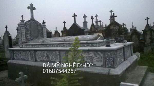 Mộ đá công giáo kích thước lớn được ghép từ những tấm ,phiến đá lại với nhau,do đó có thể tạo nên những mẫu mộ có kích thước lớn.Mộ đá công giáo sử dụng những mẫu hoa văn như tranh tùng,cúc,chúc,mai,hoa dây cách điệu.