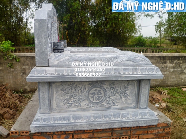 Mộ đá đôi không mái với phần bia đá chung ,hai nắp mộ được chế tác dày giật 2 cấp hình vòm ,bề mặt chạm khắc hoa văn mây .Đây là mẫu mộ đá mang hình dáng cổ kính đậm nét truyền thống .