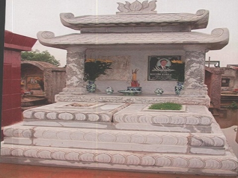 Mộ đá đôi thiết kế theo kiểu tam cấp mỗi cấp là một lớp đá ,hoa văn cánh sen được sử dụng chủ yếu,phần khung bia phía sau mộ thiết kế hai mái che.Mẫu mộ đá đôi này sẽ đẹp hơn nếu làm bằng chất liệu đá xanh ghi đậm.