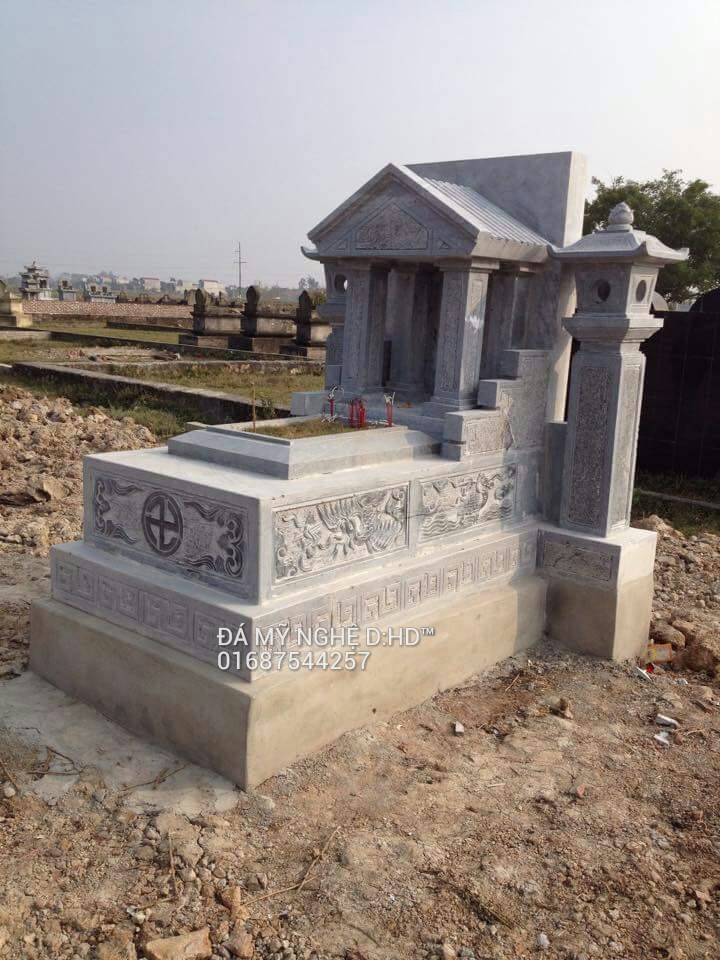 Mộ đá khối có mái che,hai bên có hai trụ đèn vuông trang trí. Chất liệu đá xanh ,chạm khắc hoa văn tứ linh.