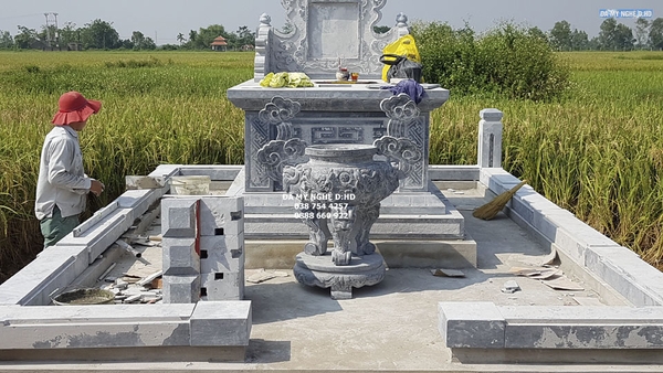 Ngôi mộ đá nổi bật trong khuôn viên với những nét hoa văn đơn giản có độ tương phản cao